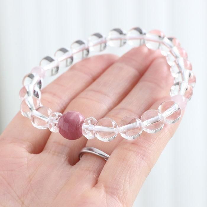 本水晶の爽やかさとインカローズとローズクォーツのピンク色がとってもキュートなブレス。数珠専門店ならではのデザインでお守り効果もばっちり!!